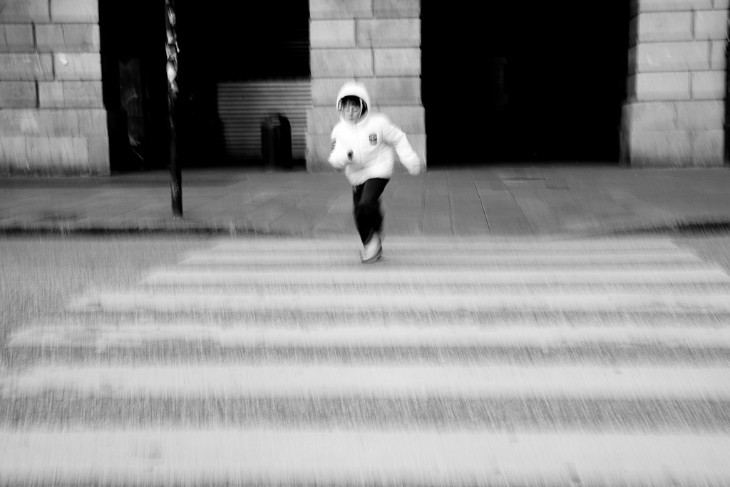 Il fotogramma presenta un bambino che attraversa le strisce pedonali di una strada urbana, correndo velocemente in direzione dell'istanza enunciativa fotografica. Sullo sfondo un marciapiede anonimo con due recessi strutturali di un edificio. L'autore mette il soggetto centralmente, e scatta con un tempo molto lento ad altezza occhi. Il risultato è una scena priva di essenza street e dal contenuto life debole. Il primo piano vuoto delle strisce pedonali, il soggetto troppo centrale che viene contrastato su uno sfondo chiaro, un mosso che non aggiunge nulla alla normalità della scena se non quello di sovraesporre la figura del bambino, complicano la lettura di questa istantanea. Il volto del fanciullo è pergiunta ad occhi chiusi. Le aperture architettoniche in fondo alla strada sono completamente inghiottite dai neri e non lasciano spazio all'immaginazione. Siamo molto lontani da quel tuo piccolo capolavoro "primi baci"..