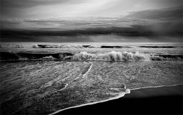 Penso che l'aspetto più interessante di questo scatto sia il contrasto tra la parte alta, tutta scandita da linee orizzontali, il cielo a fasce e le onde, e la parte bassa, con la diagonale sinuosa dell'acqua che avanza sulla spiaggia.