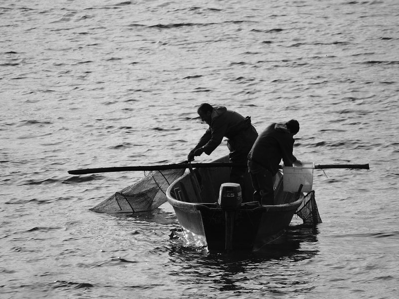 Uno scatto ben composto, con un ottimo centro d'interesse rappresentato dal lavoro intenso dei due pescatori sulla barca, intenti a salpare le loro nasse; Riesci a riprenderli in un momento sgnificativo con le loro figure disposte in maniera armoniosa senza sovrapposizioni. La resa del bianco e nero non è soddisfacente e non rende giustizia alla bontà dell'istantanea: le figure sono scure con pochi dettagli, e tutta la scena tende al grigio. I bianchi e i neri sono pochissimo rappresentati. Con pochi aggiustamenti in post produzione potresti ottenere notevoli miglioramenti.