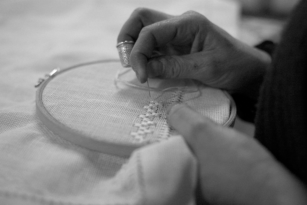 Trovo buona la tua scelta di restringere la messa a fuoco solo sull'ago. Riguardo a b/n forse era meglio cercare di avere entrambe le mani di una tonalità simile tra loro.