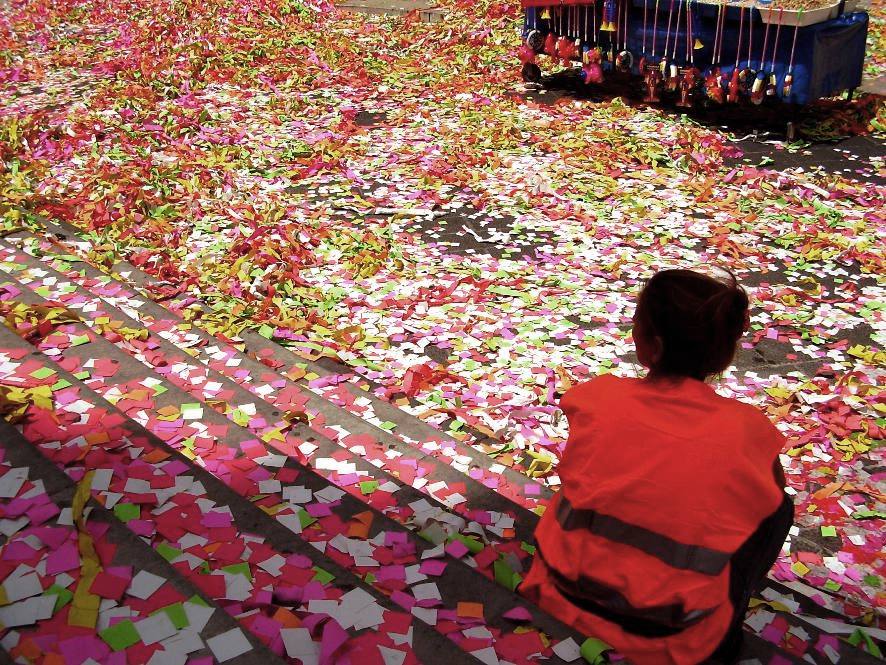 La festa del carnevale è passata lasciando uno strascico in quantità monumentale di coriandoli e stelle filanti. L'operatrice ecologica sembra riposarsi un attimo e guardare con una certa apprensione lo spazio da ripulire, che dall'inclinazione dello sguardo sembra proseguire ben oltre lo spazio delimitato dall'inquadratura.