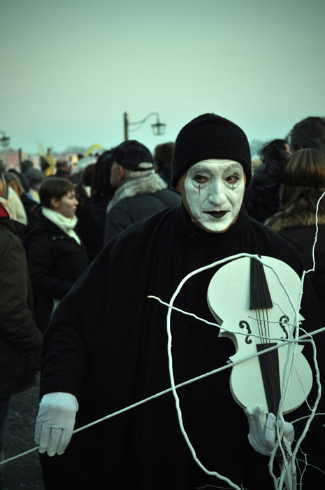| La fotografia mette in scena prevalentemente un personaggio truccato, mascherato, con i suoi attributi rappresentati da archetto e violino, che occupa il primo piano del fotogramma verticale. Lo sguardo del personaggio è sfuggevole e non realizza un legame con l'osservatore, una complicità. Il contesto caotico e affollato intorno a questa figura, ripreso da un punto di vista che tende a sovrapporre forme e colori, non aggiunge elementi significativi che arricchiscano di nuovi contenuti la rappresentazione della persona. Rimane un semplice ritratto ad una maschera di carnevale. |