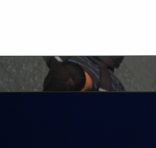 | 1/250, f/5.6, ISO 400, +1EV. Pentax K20D. Il bianco è cielo volontariamente sovraesposto, il blu la tenda da sole di un bar. In mezzo, una striscia di metallo riflettente. |