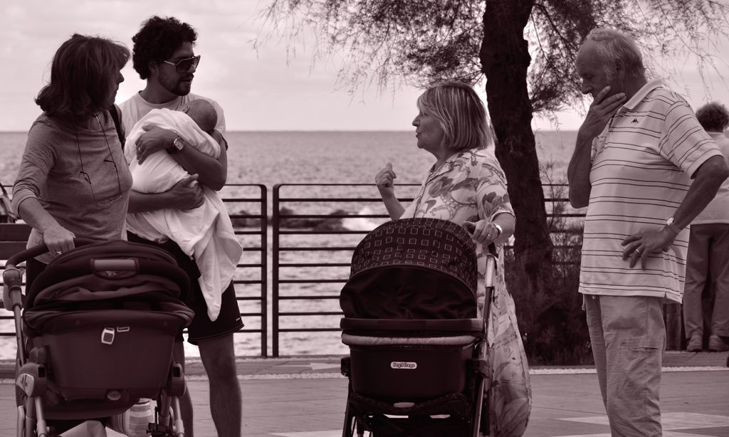 Probabilmente il momento colto è una conversazione intima tra le due coppie, ci è difficile stabilire un collegamento immediato, possono avere relazioni di parentela così come essere sconosciuti accomunati dalla maternità, dai figli, dai mille problemi dall'essere famiglia, ma questo non esce dalla foto.