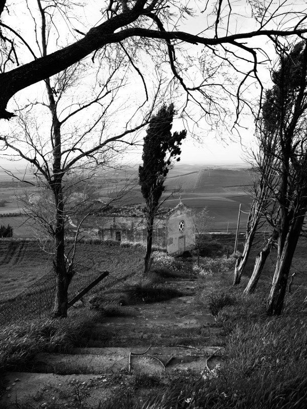 Questo scatto, ad esempio, a colori risulta una "semplice" rappresentazione di una chiesetta in stato di abbandono, mentre in b/n vengono esaltati alcuni particolari, quali la pendenza della scalinata, la pendenza degli alberi...il tutto ad evidenziare la pendenza/de-clino del sito...