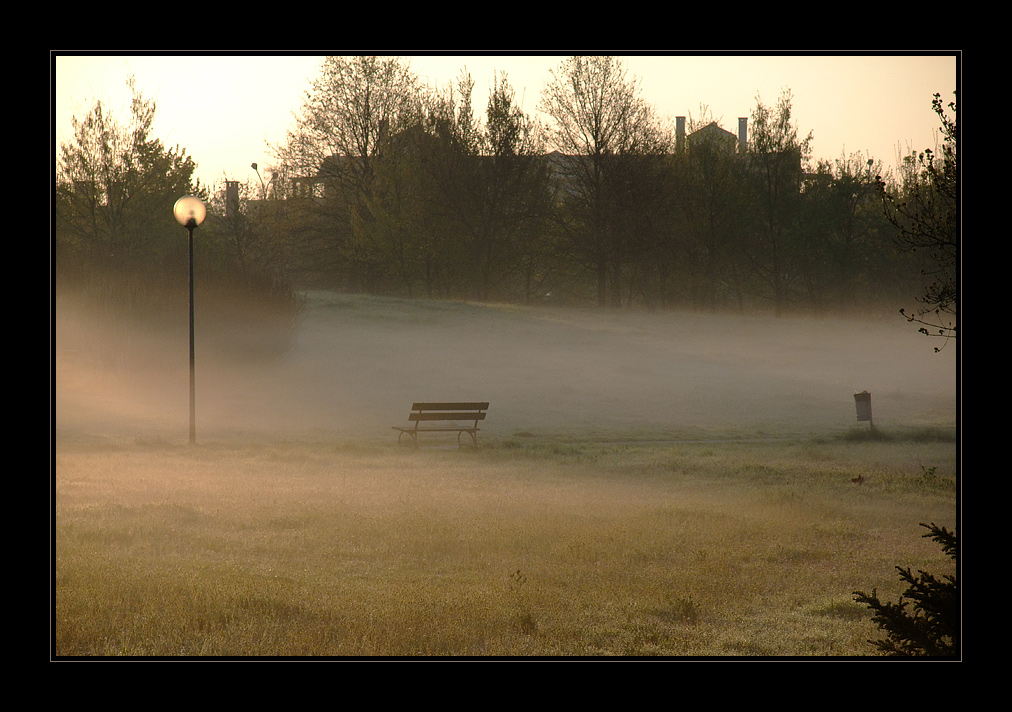 La luce è quela giusta, l'atmosfera pure... quello che mi convince meno è il resto, soprattutto l'inquadratura: i rami sulla destra sono di disturbo (poteva essere una buona idea invece includerne di più), così come è un peccato vedere tagliati gli alberi in alto. Vista la bella situazione atmosferica conveniva forse concentrarsi soprattutto sulla panchina e il lampione