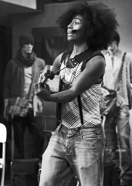 Ancora un artista di strada, ripreso durante una performance musicale. L'espressione vivace e gli attributi caratteristici non riescono a donare uno slancio interessante all'istantanea. Il soggetto viene ripreso con un piano americano e con una focale aperta che lo rende nitido sfuocando lo sfondo rapprsentato da una porzione di vetrina. E' presente una fastidiosa porzione di sedia molto chiara sulla sinistra del fotogramma che tende a distrarre l'attenzione. Purtroppo le istantanea come questa cadono quasi sempre nel già visto, nell'ovvio: l'istantanea rischia di essere dimenticata prima ancora di essere stata vista per intero. Non vi è dubbio che chi si trovava sul posto lo vede come un interessante ricordo personale, che probabilmente riesce a fare riemergere suoni e atmosfere particolari ma che purtroppo non vengono catturate in maniera oggettiva dal testo visivo.