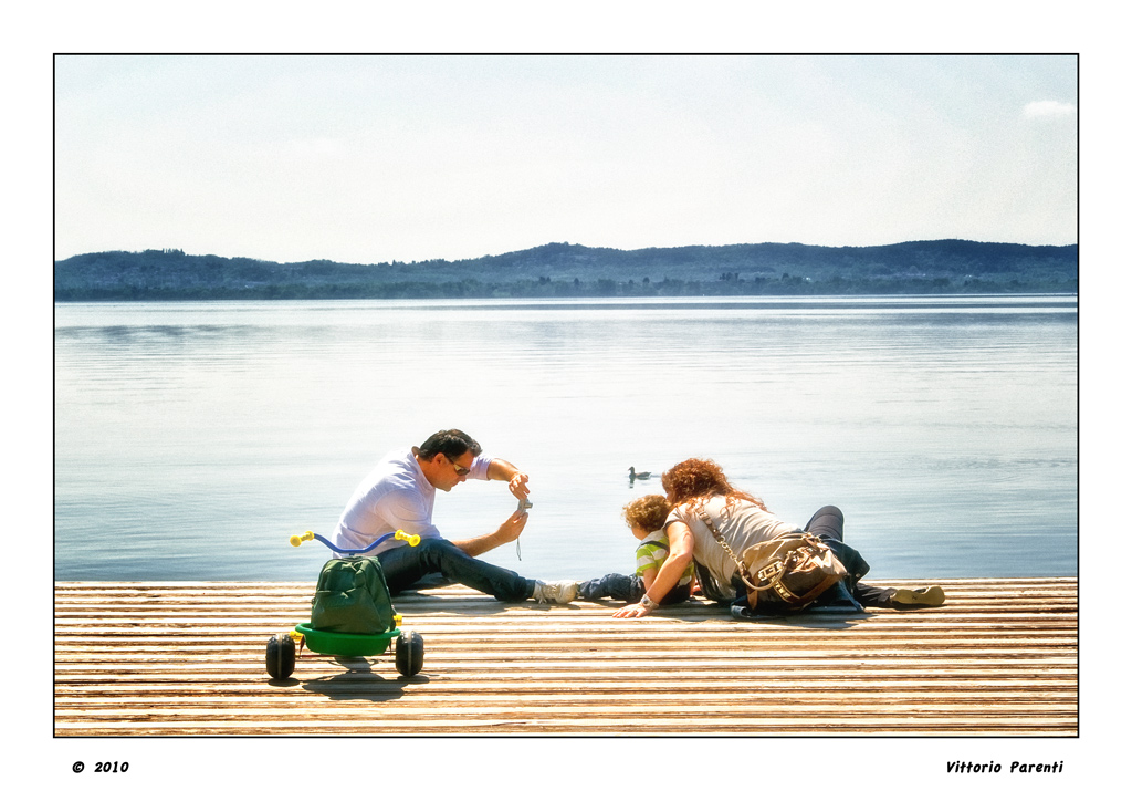 Condivido le osservazioni di Ueda sulla genuinità della scena. Volevo aggiungere soltanto a Vittorio la presenza di alcune aree sovraesposte dove vengono persi i dettagli: in particolar modo sulla schiena dell'uomo a sinistra. Inoltre la papera che nuota nel lago, poco al di sopra delle teste dei due modelli fotografati, tende a catturare molta attenzione.