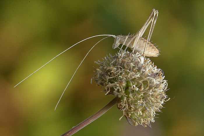 Molto bella questa tettigonia. Il chiaro del soggetto unito a quello del posatoio staccano bene dallo sfondo scuro e variegato.