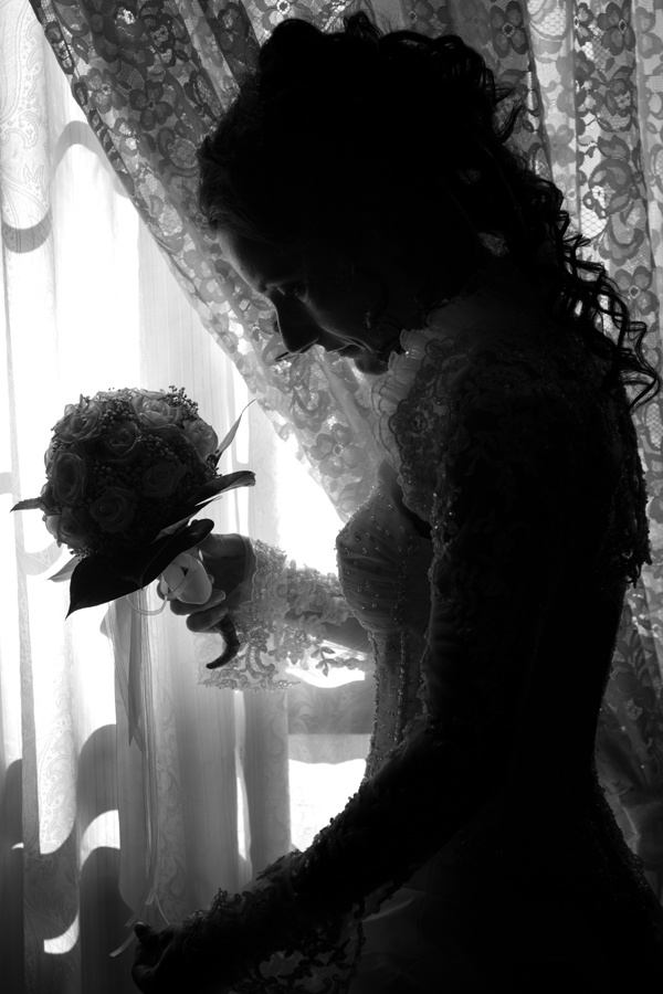 E' una bella silhouette, ma c'è una cosa molto importante, secondo me, che va sottolineata: tagli esattamente sulla mano, che è la direzione in cui cade lo sguardo della sposa. La domanda che viene da farsi è: che cosa sta facendo? Oppure: perché è triste(come ha detto qualcuno prima)?