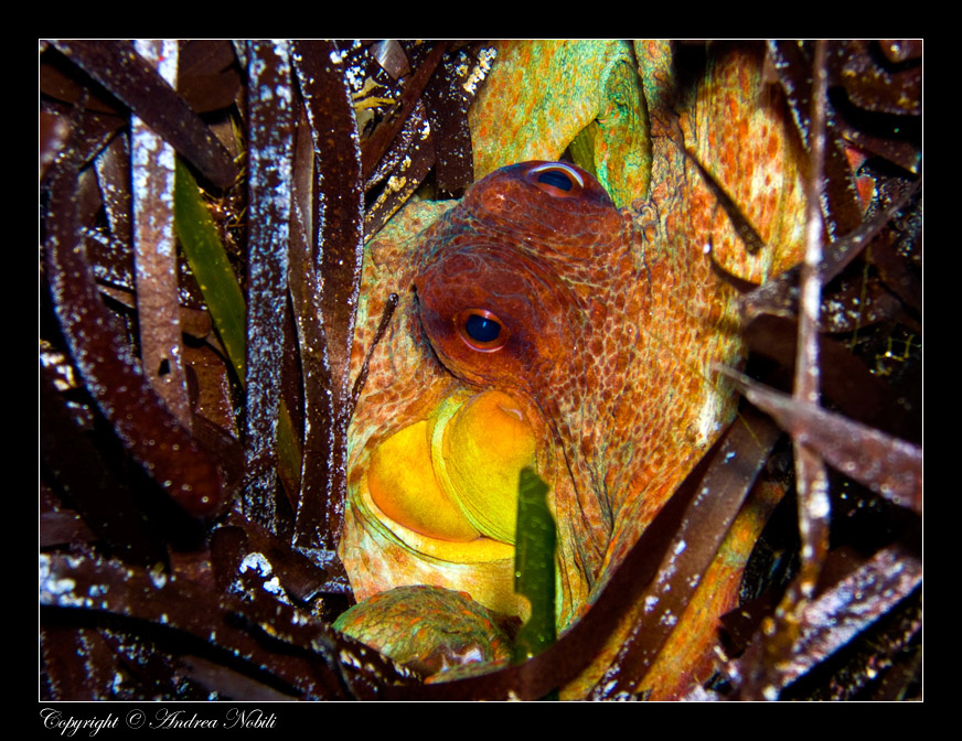 Un grosso polpo si nasconde tra le foglie di Poseidonia.