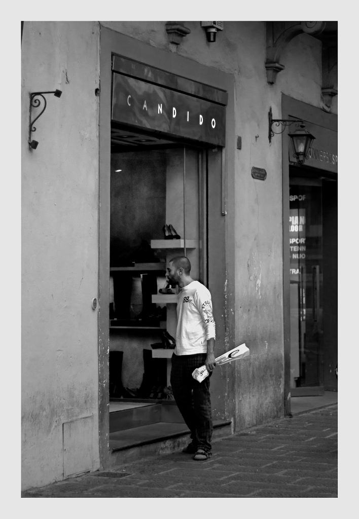 Mi piace il ragazzo che osserva la vetrina ma lo trovo troppo centrale all'immagine e forse avrei tagliato un pelino più stratto eliminando magari l'allarme superiore e la vetrina dietro