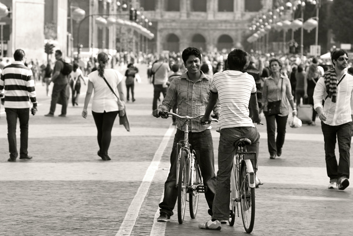 Le persone che se ne vanno, sole, attorno ai due in bici, contrastano appunto con la coppia di soggetti centrali che, lungo il loro cammino, hanno trovato un interlocutore, un amico o chissà...