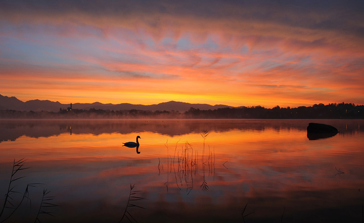 Una silenziosa quiete infuocata...fermata preziosamente nel tempo e nello spazio fotografico dalla sottile e netta silhouette di pochissimi elementi, cigno in primis.