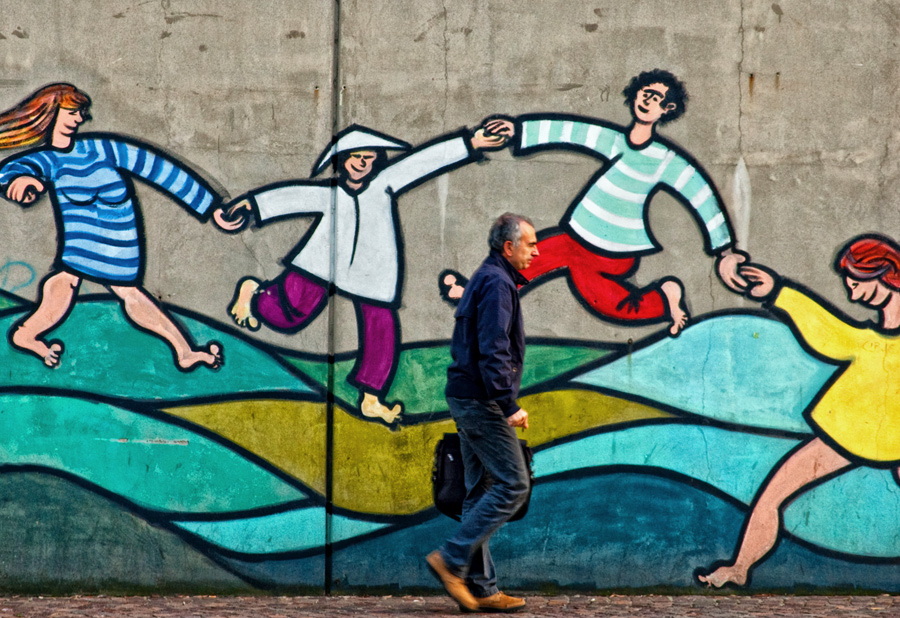 Weber ha scritto che il colore provoca un apparente cambiamento di dimensioni. Superfici o oggetti di identiche dimensioni sembrano più grandi se sono chiari e più piccoli se scuri. Ed è quello che succede alle forme di questa tua scena, i bambini raffigurati su quel murales assumono delle proporzioni enormi e l'adulto (bella la sua posa) sembra piccolo piccolo, nonostante sembrano di egual misura.