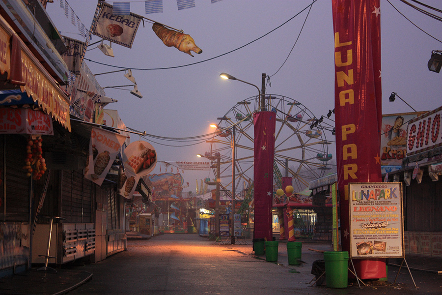 i giochi fermi, immobili creano una strana atmosfera di aspettativa, aumentata anche dalla mancanza di figure umane...al confine del surreale