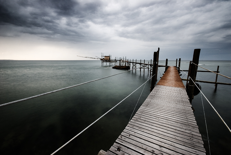 Mi spiazza un po' questa obliquità vertiginosa che mi fa entrare velocissima nel quadro. Ho avuto un attimo di incertezza al primo sguardo e poi la passerella ti cattura, scorre dinamica sotto lo sguardo, eppure, ancor più sorprendente, con la focale ampia ci fa rientrare perfettamente concordi all'orizzonte al trabucco finale. Ho avuto il piacere di conoscere il luogo di persona al tuo mitico raduno , e devo ammettere che le tue trasfigurazioni gli reagalano un altro respiro, e ne scoprono il volto più segreto. Paesaggi ad amplissimo respiro, che si fanno fuga prospettica ed emotiva, tuffi nel fantastico a partire dalla realtà del mare e della salsedine.