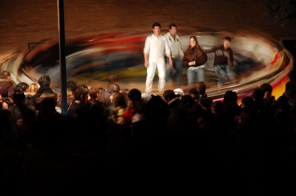 Il mosso estremo della parte ruotante, che appena lascia intuire gli altri personaggi in scena, quello meno spinto nella parte centrale, presumibilmente in oscillazione, quello accennato e forse non voluto di alcuni personaggi del pubblico, che semplicemente ... si sono mossi durante la lunga esposizione.