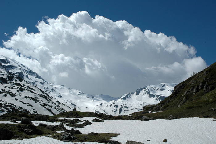 Apro il giro dei commenti, perchè credo che la tua immagine meriti comunque una certa attenzione. Poteva essere una foto molto drammatica, il nuvolone bianco sembra messo lì apposta, però è tutto molto piatto, forse complice la luce non molto adatta, ma una opportuna elaborazione in PS. ti consentirebbe di ricavare una gran bella foto, anche in bianco e nero. Prova a lavorare di curve in Lab (sulla sola luminosità) aiutandoti con maschera di livello, le cose cambiano.