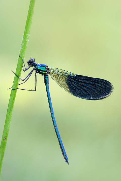 Ottima la nitidezza del soggetto, basta osservare i disegni delle ali per rendersi conto di ciò. Molto belli anche i colori metallizzati di questa Calopteryx. Per renderla a mio avviso perfetta, l'avrei collocata leggermente più in alto, rendendo così lo scatto più dinamico con una migliore composizione.