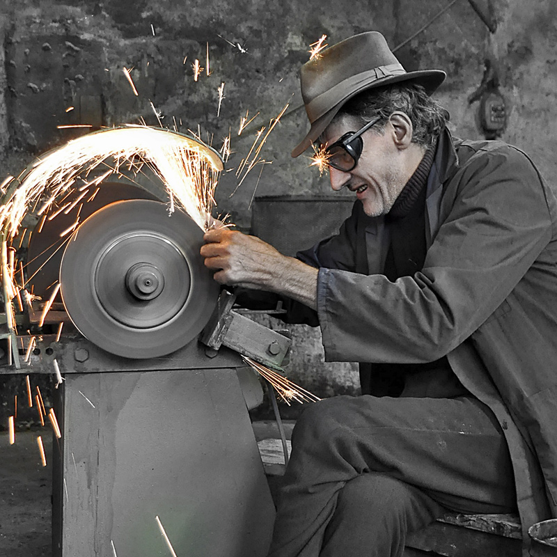 Direi che si tratta di un Ritratto ambientato nel gesto... eheh. Giustamente tu ti servi di una parziale desaturazione su alcune parti per accentuare l'importanza di quelle scintille che si sprigionano dalla ruota. il volto di lui si tende, inevitabilmente, all'allargarsi di questa invasione di scintille.