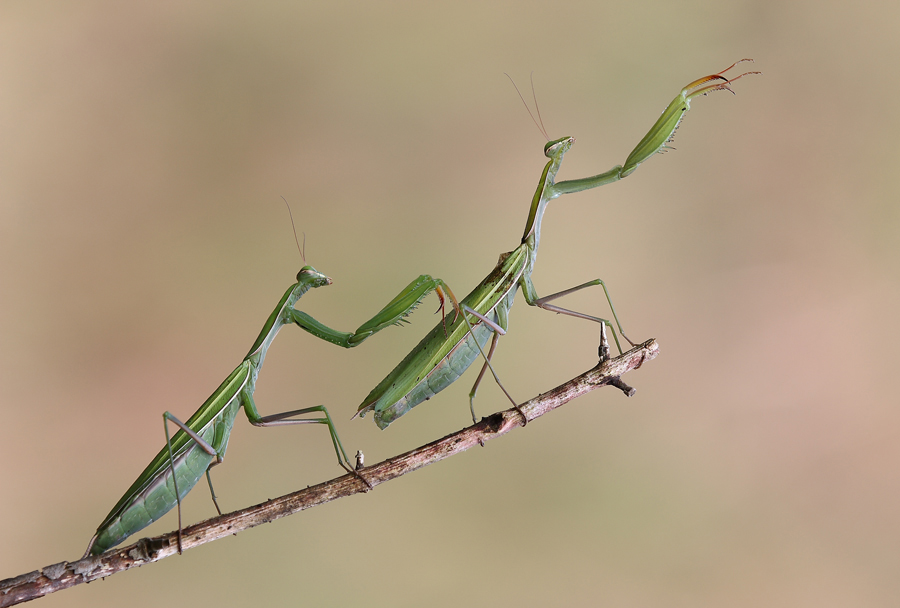 Ti sei limitato a 7,1 di diaframma, potevi stringere ancora un pelino per ottenere piu' nitidezza anche sulla prima mantide di sinistra.