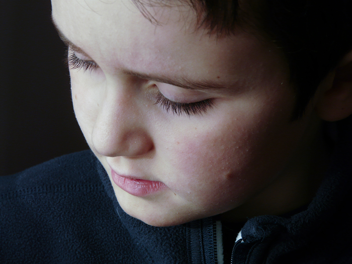 In effetti l'illuminazione è un po' "dura" e crea una luce che tende ad appiattire i volumi del viso; inoltre l'inquadratura è troppo dall'alto e fa sì che lo sguardo non solo non si veda, ma che dia l'impressione quasi che il soggetto abbia gli occhi chiusi. Infine il taglio della fronte a metà comunica una sensazione di poca precisione nell'inquadrare.