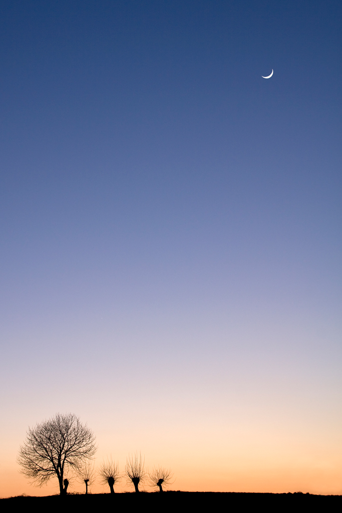 Semplicità estrema, colori delicati, composizione dal decentramento volutamente estremizzato, dove al filare di alberi spogli in silhouette, fa da contrappeso la falce di luna, come un delicato ornamento.