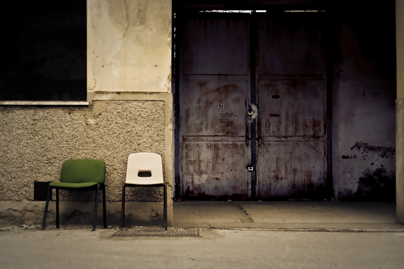 pesanti lucchetti al portone quasi a precludere la luce al di là di esso, il buio che riempie la stanza e le due sedie, diverse tra loro ma con un compito uguale che qui però suona tanto di surreale.....sarà forse l'atmosfera del luogo che ci proponi