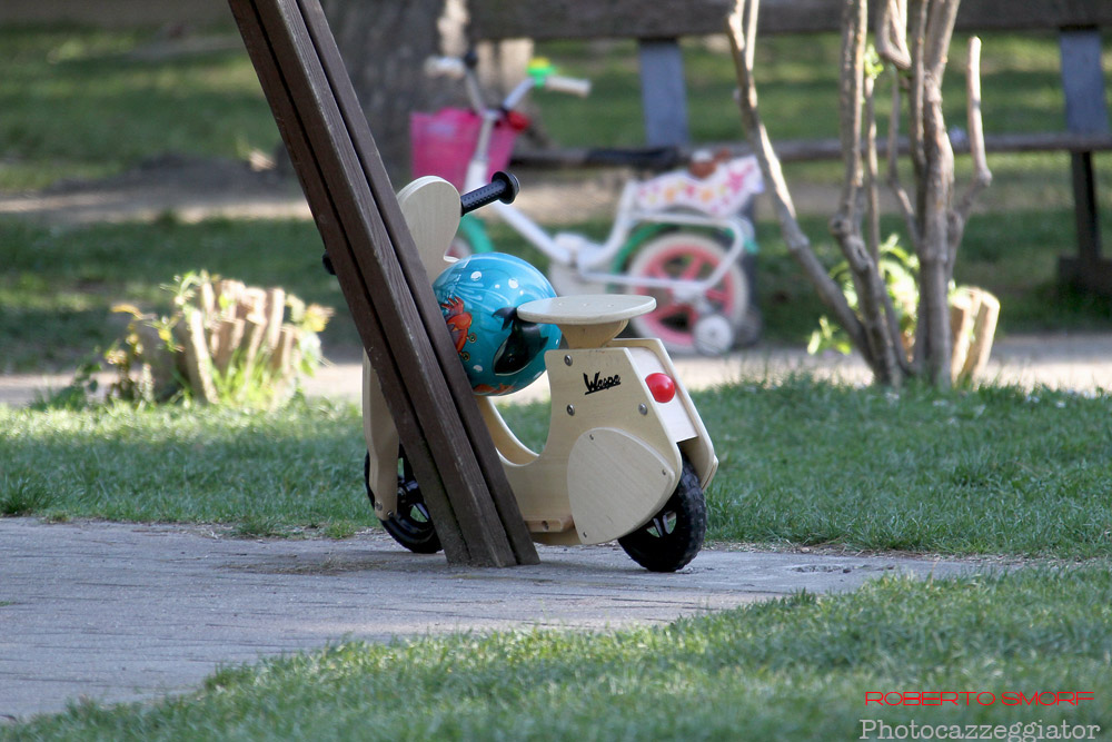 uno sfocato ad hoc per rendere nitida la vespa ( con la "W"...) del bimbo in contrapposizione alla bicicletta da piccola signorina sullo sfondo...