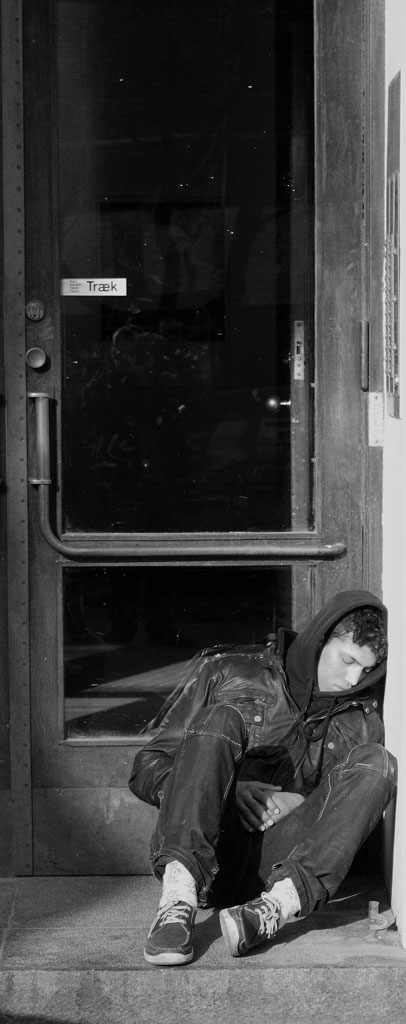E' l'ingresso di un palazzo in centro a Copenaghen, il ragazzo dormiva nel primo pomeriggio con il sole in faccia sui gradini della porta d'ingresso. Forse dovrei raddrizzarla leggermente... e non mi convince nemmeno tutto lo spazio che ho lasciato sopra.