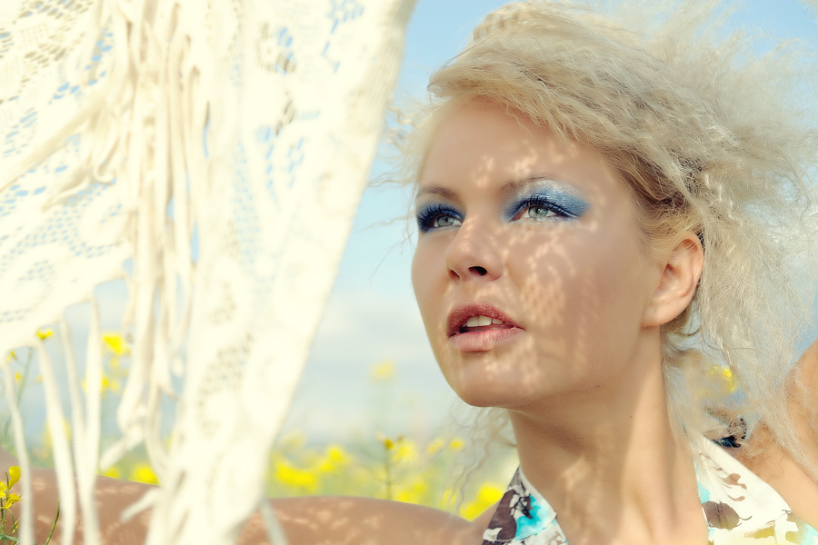 Anche io ho notato l'aspetto sottolineato da Aerre: la relazione fra gestualità della Modella e lo scialle, e probabilmente potevi allargare un po', perdendo però il risalto del colore dei bellissimi occhi.