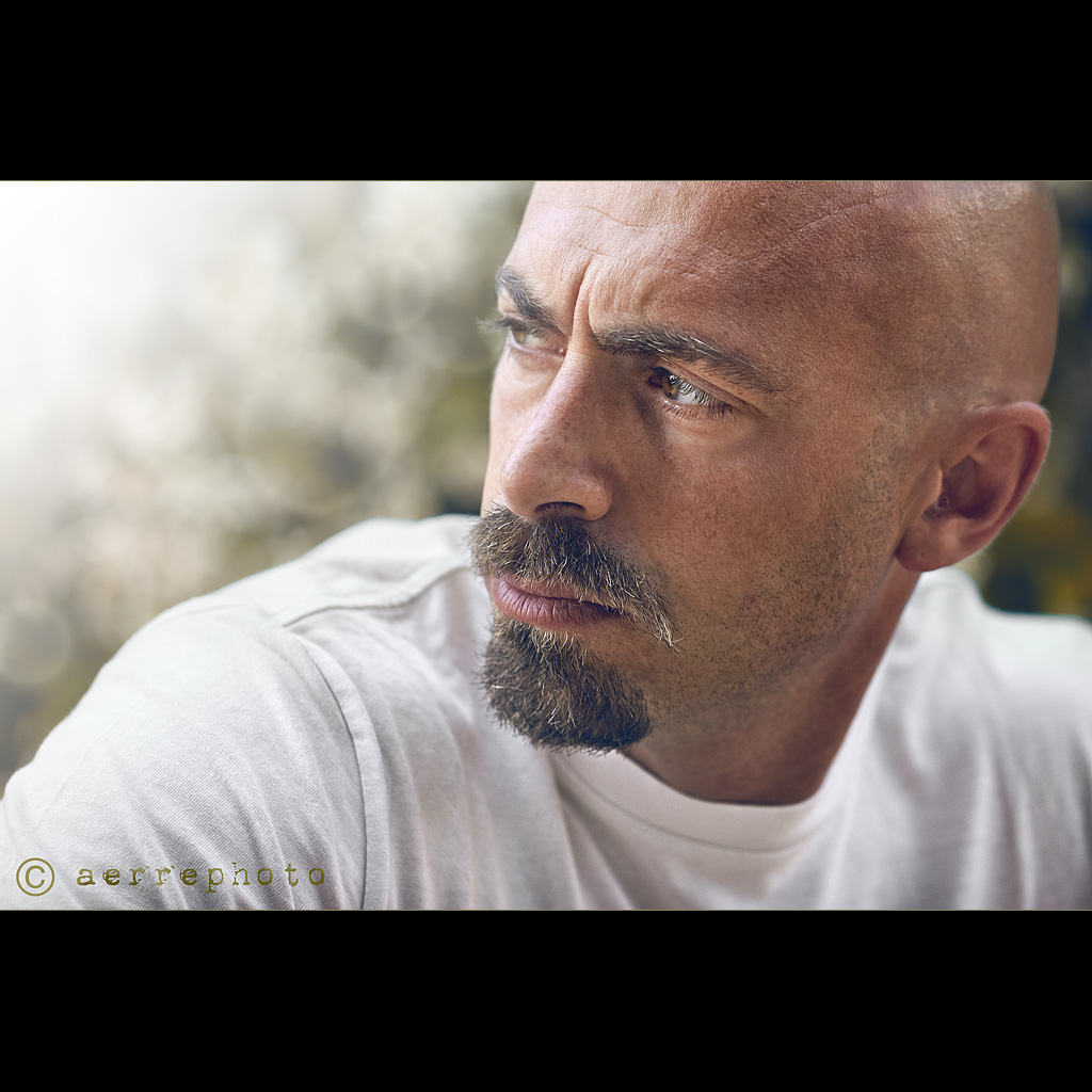 Tiziano era effettivamente distratto da qualcosa. Lo scatto era nato diversamente, avevo chiesto a Tiziano di fare un ritratto all'esterno, la "location" è il viale di accesso al luogo in cui lavoro. In quell'istante, ...mentre lui posava (è accovacciato per terra), sono arrivate un paio di persone, ...due clienti.