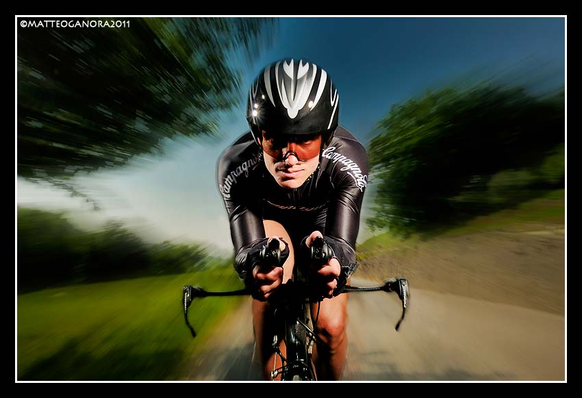 L'idea iniziale era di fare questo scatto con i clamp attaccati davanti... ci abbiamo anche provato, ma montare un clamp con un braccio di un metro su un telaio in carbonio che sembra fatto di carta... da dei problemi, in primis con le vibrazioni... l'alternativa era usare un mezzo tipo pickup, ma anche in quel caso, o lo scatto si faceva in pista, su una superficie molto liscia, oppure per ottenere un mosso importante, si sarebbe sacrificata la nitidezza generale dell'immagine... e quando lavori per un azienda, è essenziale dare priorità alla leggibilità dei marchi o dei prodotti (in questo caso le leve cambio sulle protesi).