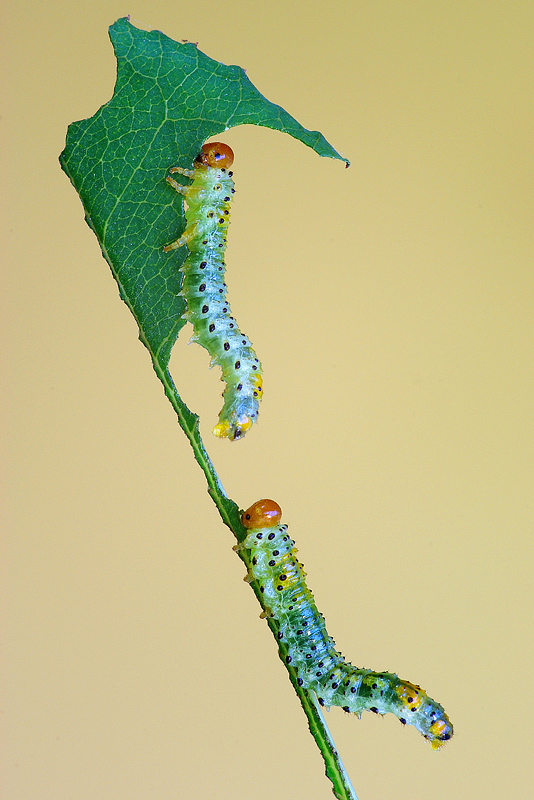 | Grandissimo scatto, che colori armoniosi e che compo OTTIMA. Però non sono bruchi, ma larve di qualche imenottero. |