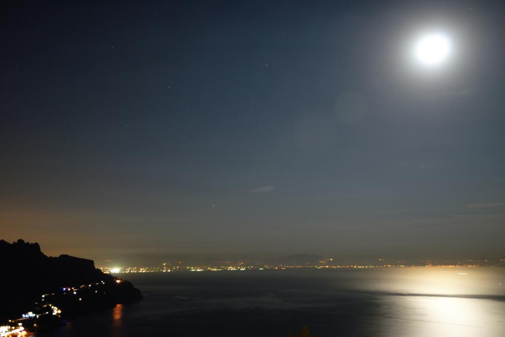 Anche se dipende dalla morfologia del golfo la linea delle luci, che sostituisce la line dell'orizzonte, sembra pendere leggermente a sinistra.