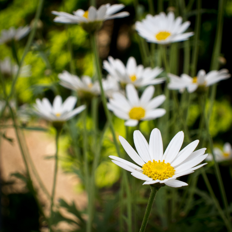 | L'immagine è gradevole e la margherita in primo piano è ben a fuoco, tuttavia la confusione nello sfondo, anche se uniformemente sfuocato, disturba un po' la visione, specialmente la parte chiara in basso a sinistra. |