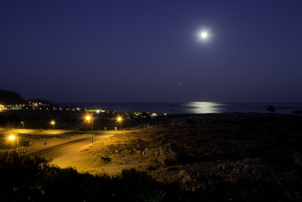 Non sono completamente convinto della posizione che hai scelto per scattare la foto, luna e mare sono bellissimi, piacevole anche vedere il contrasto di colori tra il cielo e la zona illuminata dai lampioni, ma il cassonetto dell'immondizia toglie un po' di poesia ed anche la strada con il mucchio di sabbia secondo me non sono il massimo.