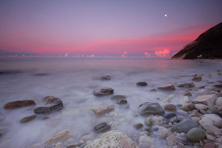 In questi paesaggi, personalmente, apprezzo quando c'è un primo piano a riempire la composizione. Mi rendo conto che la mia è una visione "classica" e tradizionale della buona composizione fotografica; ma d'altra parte il fine di una fotografia di paesaggio, quando non si tratta di mera documentazione (e questo non mi sembra il caso, dato che immagino che il tuo intento fosse artistico ed espressivo) è proprio una buona composizione. Forse sarebbe bastato un pietrone in primo piano a sinistra a bilanciare la massa scura del promontorio a destra.