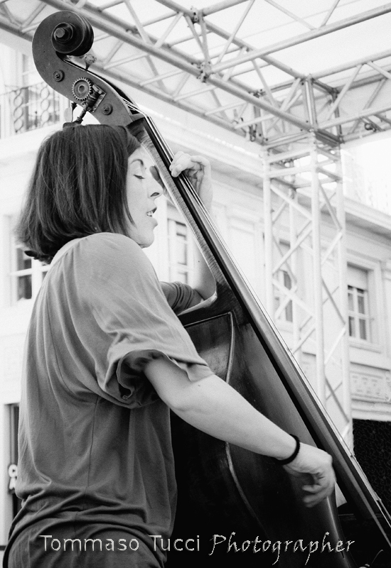 il b/n che hai scelto è di una tonalità adatta allo scopo finale. Tuttavia, credo che le condizioni di luce ti abbiano portato ad un risultato un po' incerto, sopratutto a livello dei bianchi. La composizione è interessante : ottima l'idea di costruirla sulla diagonale, anche se il volto della suonatrice rimane effettivamente un po' sacrificato.