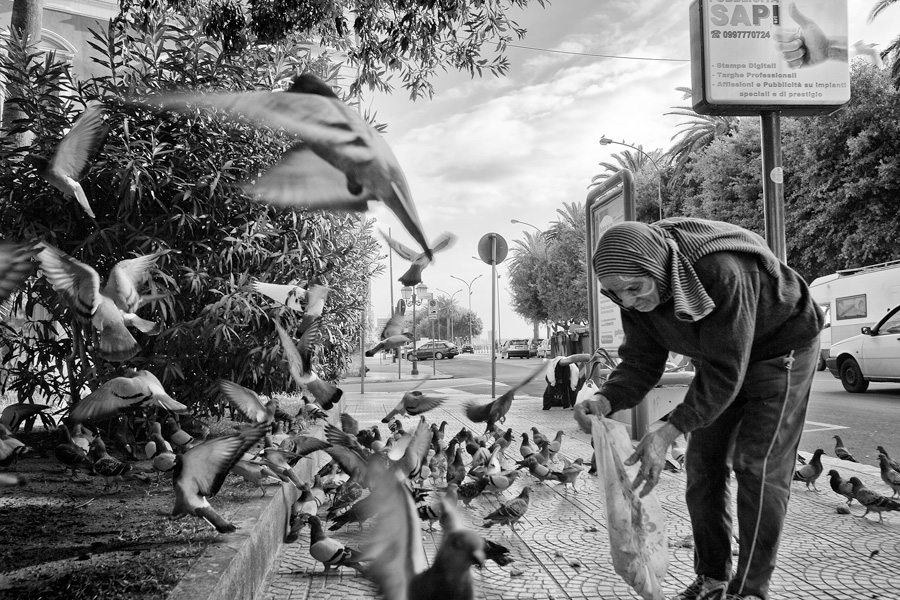..che si regga sul cartello non credo proprio..(quale sarebbe la sua funzione?).Credo invece che la sua forza sia in quel fermo immagine in primo piano dei piccioni che gli dà un senso di frame cinematografico e che mi ricorda la cinematografia favolistica dell'America degli anni 90. Ottimo il bianco e nero e la composizione.