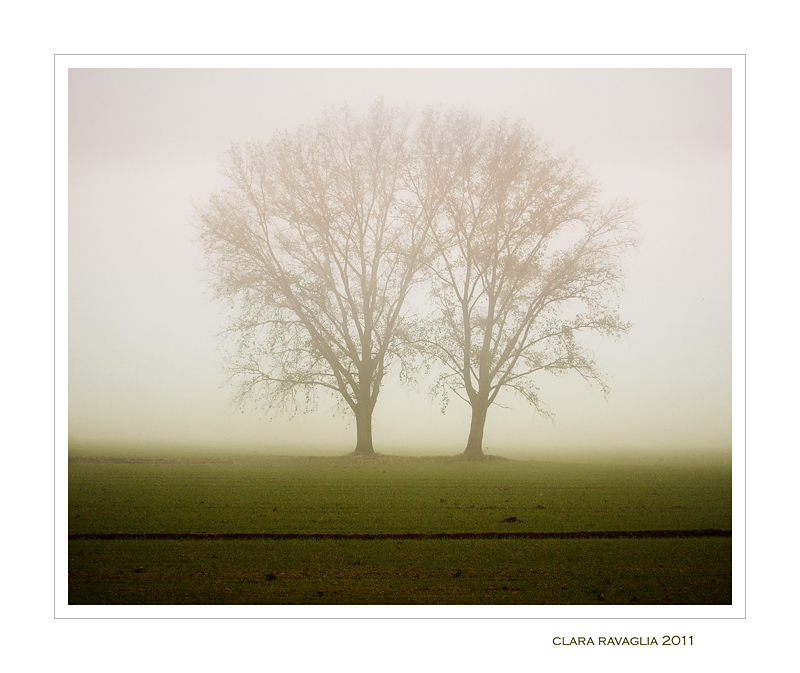 Hai ragione...ci sono attimi quando la nebbia cede un po' al sole nei quali si creano condizioni magiche. Così ricercati e così rari...Questo mi pare uno di quelli. Gli alberi gemelli che escono dal tappetino verde sono bellissimi.