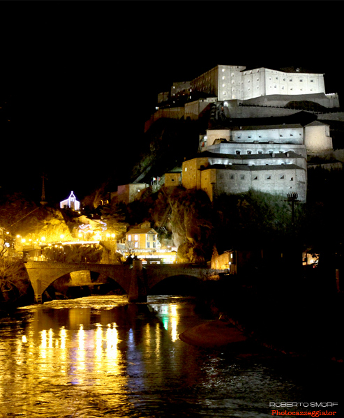 Una bella notturna del forte di Bard; a me non dispiace; forse un po' impastate le luci del borgo; ma eri su cavalletto?