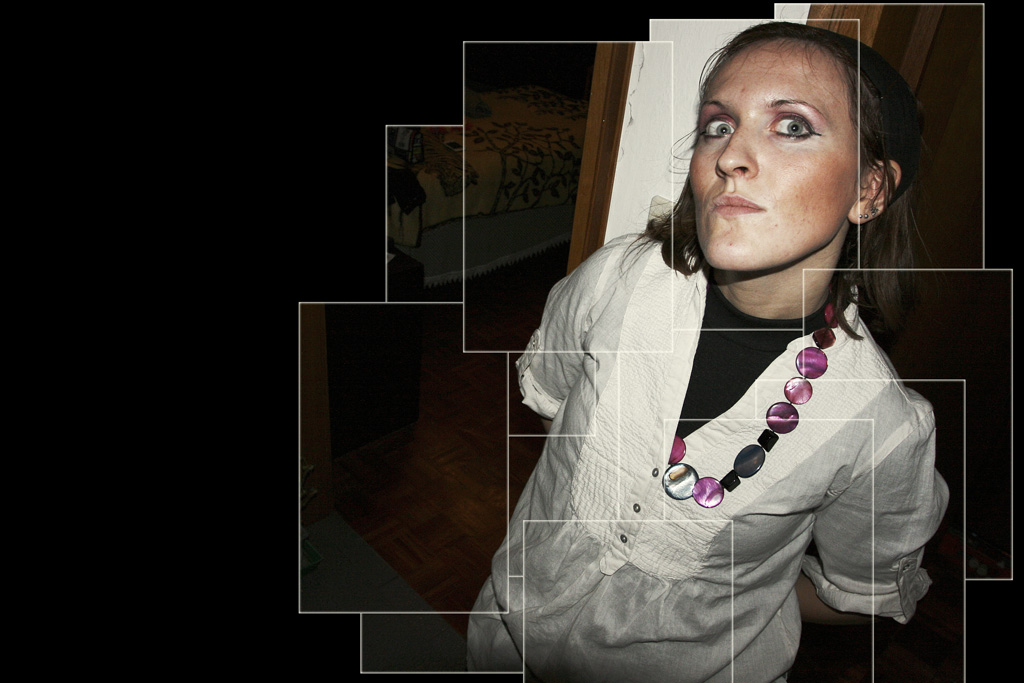 Lo scatto originale caratterizzato da un'inquadratura un po' insolita, derivata dall'uso del grandangolare, l'ingradiente di base, mi pare possa andare bene. Quello su cui penso devo lavorare è il collage, però cosa effettivamente non funziona? La disposizione o la scelta della forma del singolo blocco, il rettangolo? Proprio dopo aver postato la foto, mi sono accorto di aver tagliato la linea della porta alla sx del soggetto, cosa che sarebbe da evitare.