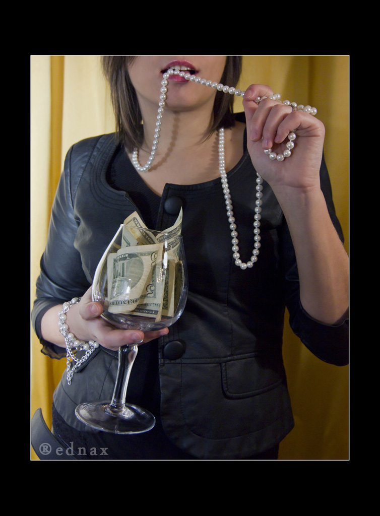 Scusa la franchezza ma di "strane voglie" qui ne vedo poche. La modella addenta le perle e tiene in mano un bicchiere pieno di soldi. Scusami ma non riesco a capire di quali voglie possa avere una donna che si presenta così. Al di là del messaggio la foto ha ombre evidenti ed una luce sbilanciata sulla sinistra. Smile