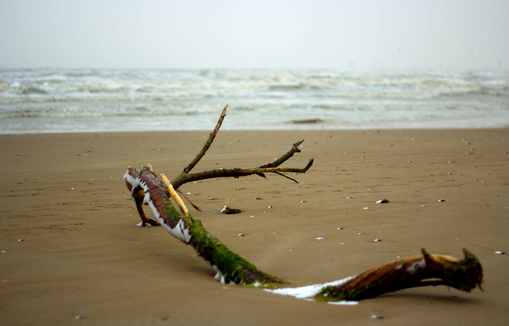 Sono d'accordo con Mario Zacchi per i suggerimenti che ti ha dato, spesso si vedono foto simili a questa, cioè con il ramo spiaggiato ed il mare sullo sfondo, fatte con un grandangolo spinto e diaframma chiuso in modo da avere tutta la scena a fuoco.