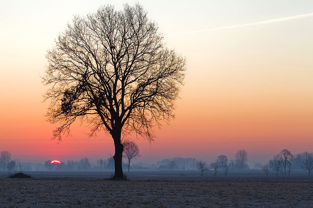 Sotto,il gelo del prato contrasta con efficacia l'esercito di alberi immersi nella leggera foschia.