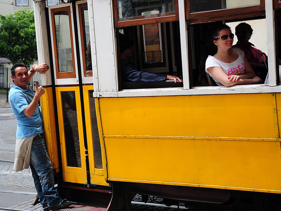 Non so di quale nazionalità sia il simpatico signore aggrappato al predellino, ma sicuramente è un "portoghese" nell'accezione popolare del termine. Smile (anche perchè il biglietto di quel tram, forse solo per i turisti che di solito lo acquistano a bordo costa 2,85 €!!!)