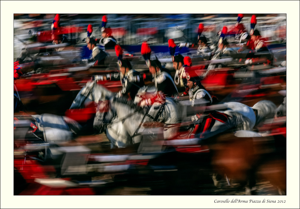 La confusione la da il fatto che in realtà sono due reggimenti che simulano una carica.... uno proveniente da destra con cavalli marroni e uno da sinistra, quello che ho seguito, con cavalli bianchi, quindi credo che l'intersecarsi dei cavalieri renda l'incoerenza tra ciò che vedi. Le immagini che vedi strisciate sono altrettanti carabiniei a cavallo che corrono dalla parte opposta e non stanno ferme. Le pergamene che vedi invece sono i cordoli a decoro della spalla destra della divisa storica che in movimento e il tempo "lungo" danno quell'effetto. E ovvio che così non si capisce.