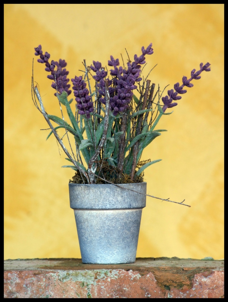 La piantina è finta (la lavanda vera a casa mia non è ancora fiorita) ed è alta appena una dozzina di centimetri. Il tutto appoggiato su un vecchio mattone e rigorosamente scattata in quel di Sarzana, terra di confine tra Liguria e Toscana.